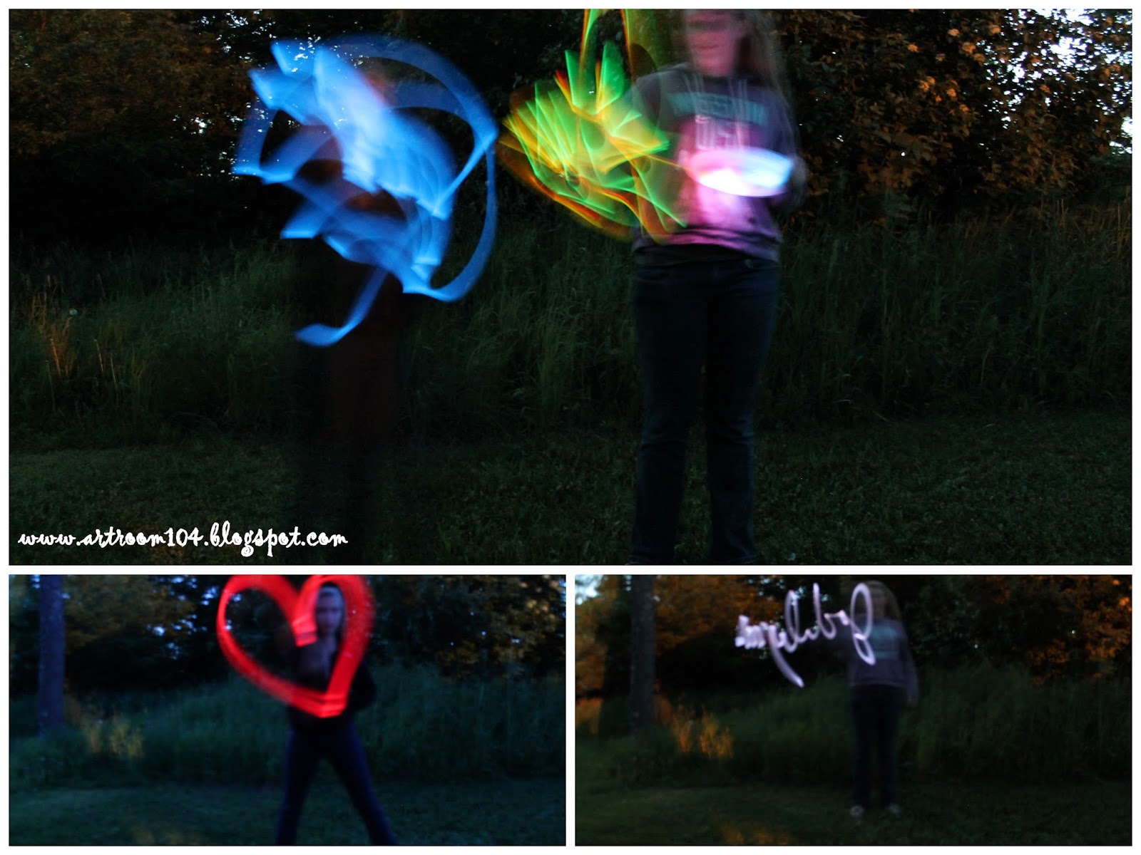 I really enjoyed fooling around with these. I used my tripod and my DSLR camera. I put it on manual, opened up the shutter for anywhere from 10 seconds to 25 seconds. I also had to turn off the automatic focus. Even though the night pictures outside look like it was dusk, it was actually very dark outside.