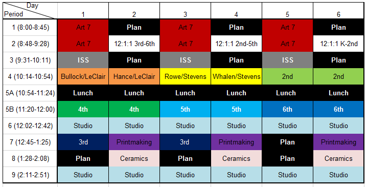Speaking of my classes, I'd like to give you a glance at my ridiculous schedule this year. I sort of did this to myself a bit this year by taking on an extra class. My union contract states we teach for 6 periods, have a prep, a lunch, and a duty. Well, at the end of the year last year, things got changed around and classes shortened a bit to add a 9th period into the schedule to create a common study hall time in the high school.